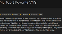 Yep, I play them too... it's what made me want to do this. Anyway, check out my top 8 current favorite visual novels, plus I review my own game! It's all for fun and helping spread the word about some...